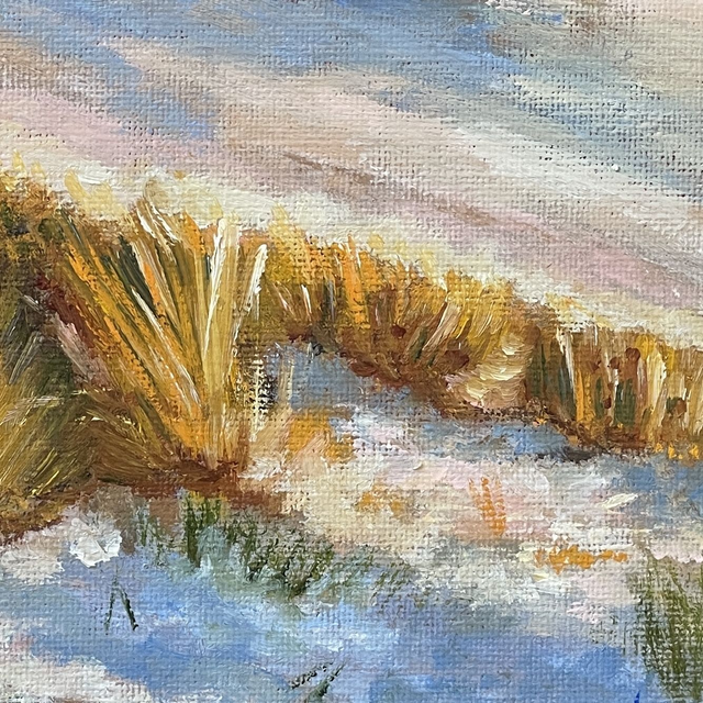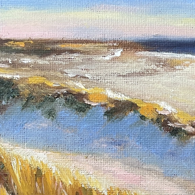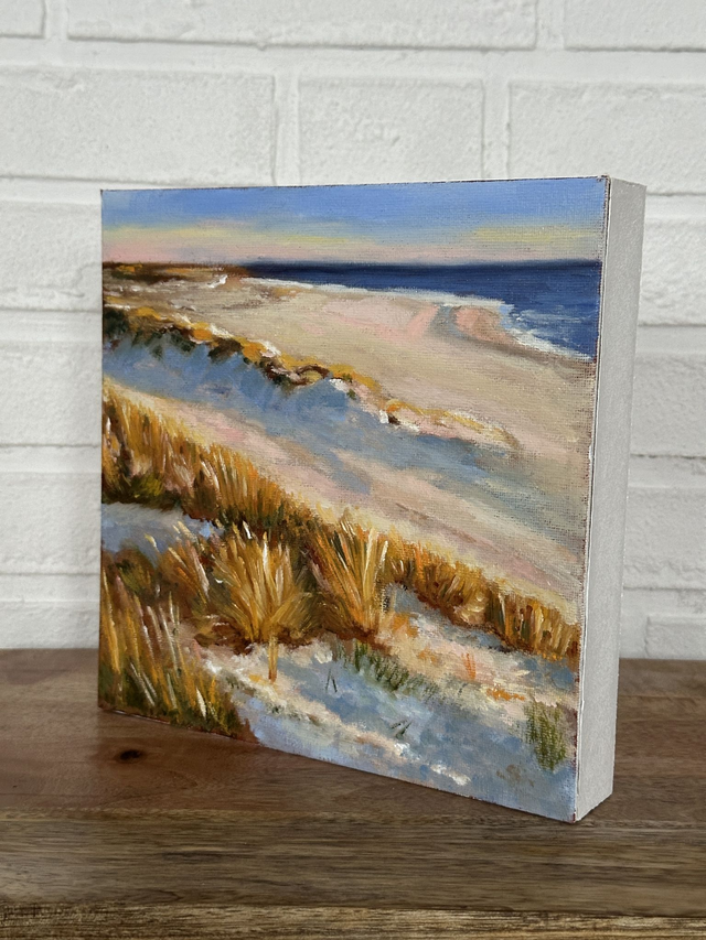 Kennst du diesen Moment, wenn der Strand im warmen Licht des Abends liegt und alles ein wenig langsamer wird? Diese kleine Ölmalerei hält genau dieses Gefühl fest. Es ist ein ruhiger Augenblick zwischen Meer, Sand und Licht, der vielleicht auch bei dir Erinnerungen wachruft.