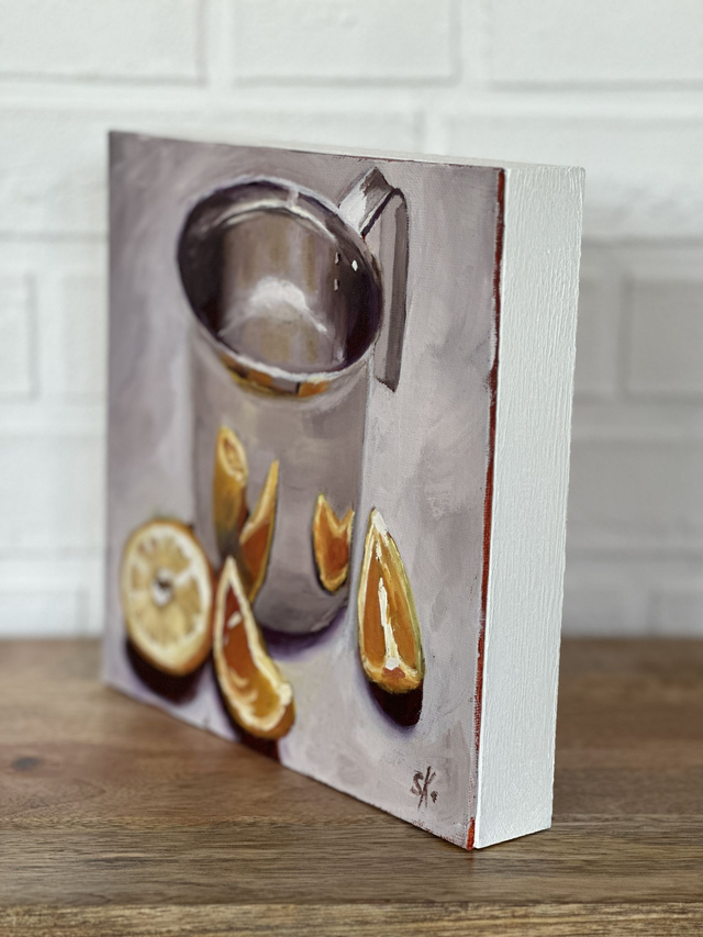 Dieses Daily Painting wirkt alleine oder als Set mit den anderen im gleichen Stil gemalten Stillleben. Probiere es aus. Es sieht in jeder Küche toll aus, aber auch im Esszimmer ist dieses kleinformatige farbenfrische Bild ein absoluter Hingucker und erfreut Dich jeden Tag.