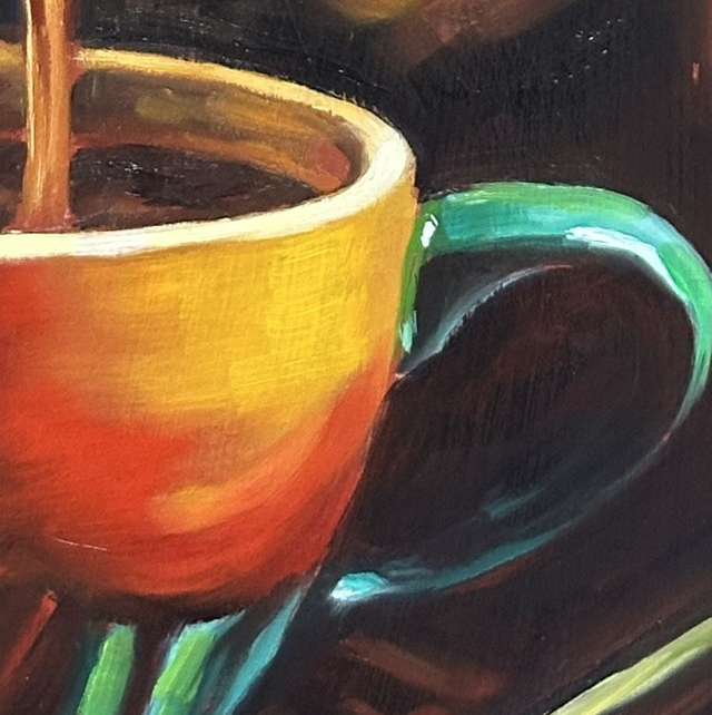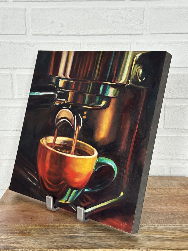 Manchmal reicht schon ein kleiner Moment, um den Tag ein bisschen ruhiger werden zu lassen. Vielleicht kennst du dieses Gefühl, wenn der erste Espresso in die Tasse läuft. Dieses handgemalte Original hält genau diesen Augenblick fest. Es sind das warme Licht, die tiefen Farben und die stille Freude auf einen frischen Espresso. Ein feiner Akzent für deine Küche, deine Kaffeebar oder den Essbereich.
