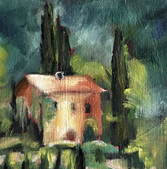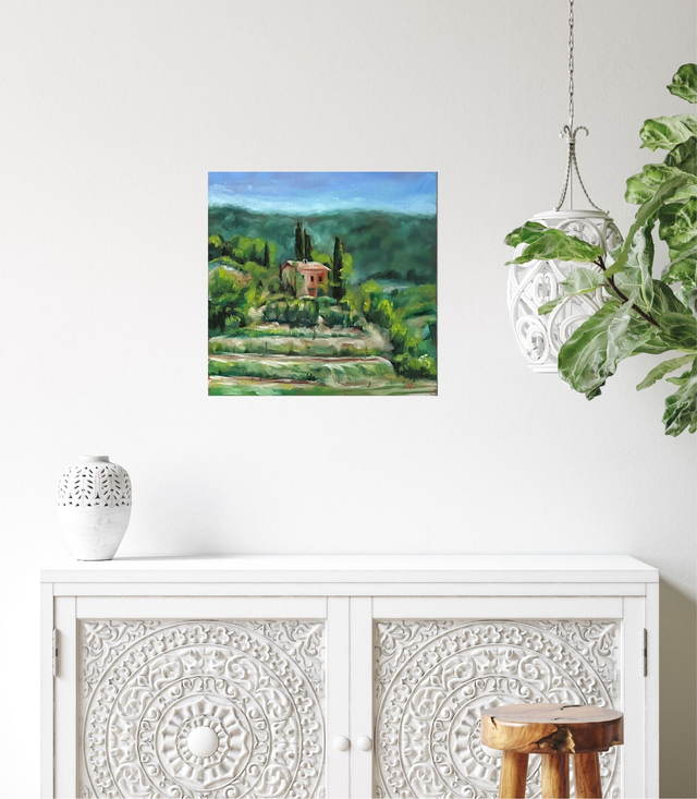 Ein sommerliches Ölgemälde voller Wärme und Licht. Das kleine Haus zwischen Zypressen und Hügeln erzählt von Ruhe, Sonne und dem besonderen Zauber der Toskana.