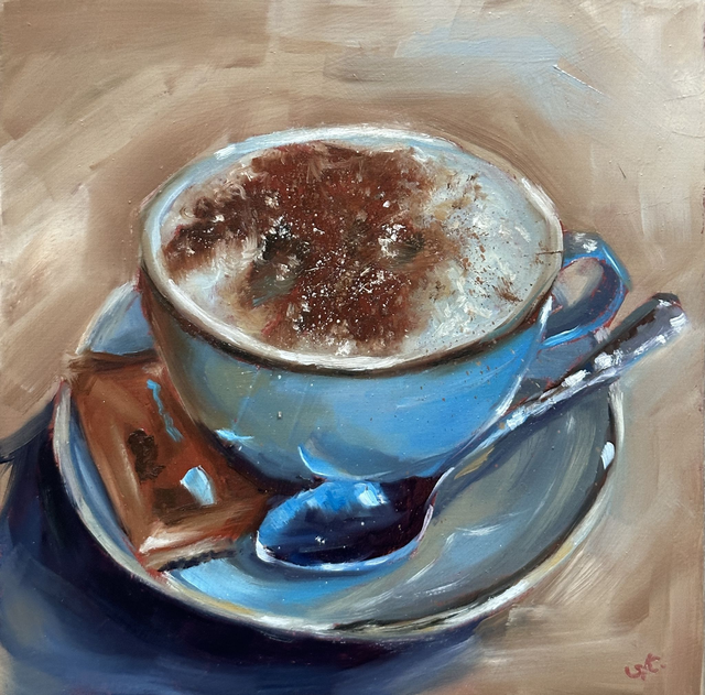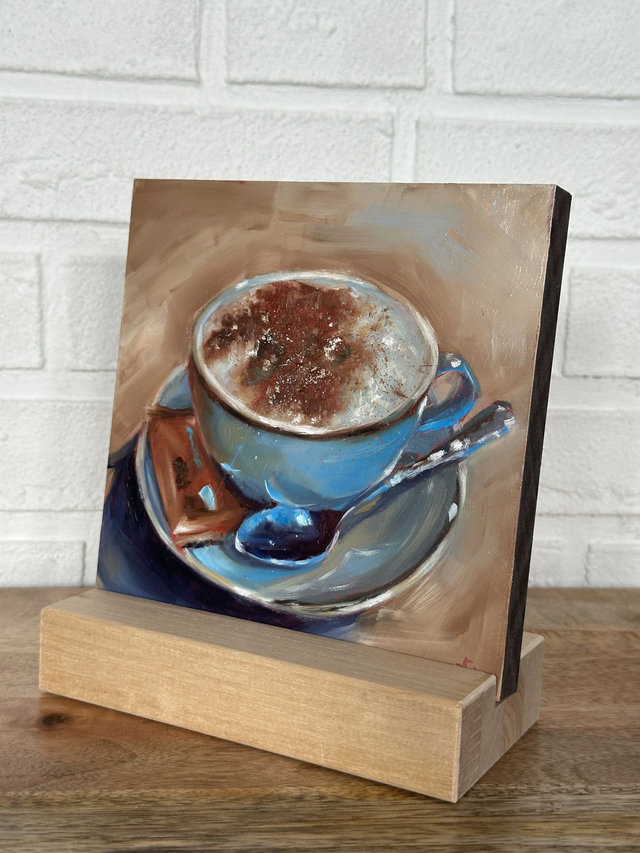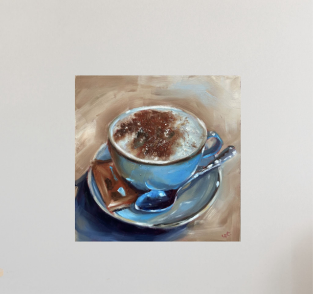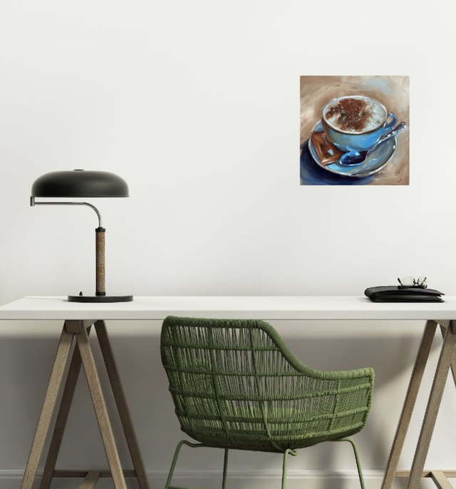 Die sanfte Crema, das leuchtende Blau der Tasse und das Spiel des Lichts fangen einen stillen Augenblick des Genusses ein. Das Werk ist perfekt für alle, die ruhige Momente und feine Details lieben. Es ist zudem ein idealer Blickfang für die Küche, das Esszimmer oder als Geschenk für Kaffeeliebhaber.