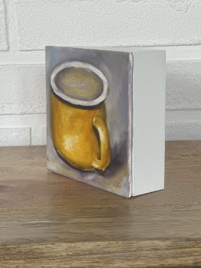 Mit warmen, goldgelben Farbtönen erinnert dieses handgemalte Ölbild an eine ruhige Kaffeepause, an Kindheit, Wärme und Geborgenheit. Die Emailletasse leuchtet im sanften Licht und bringt einen Hauch Nostalgie in dein Zuhause.