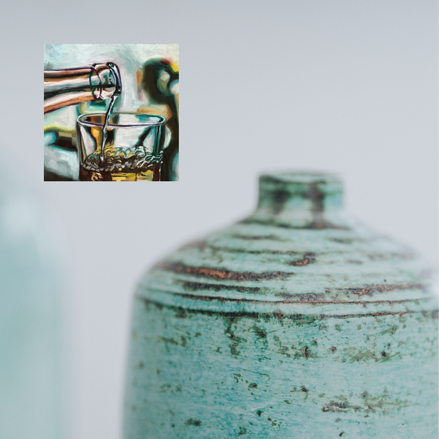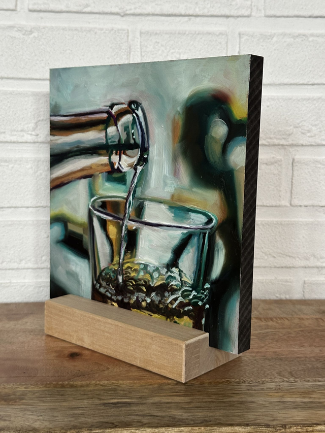 Ein kleiner Moment der Erfrischung. Dieses handgemalte Ölbild zeigt ein kühles Getränk im sanften Licht. Klare Farben, feine Reflexe und eine ruhige Komposition verleihen dem Motiv Leichtigkeit und sommerliche Frische; fast so, als würde das Licht noch nachklingen.