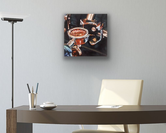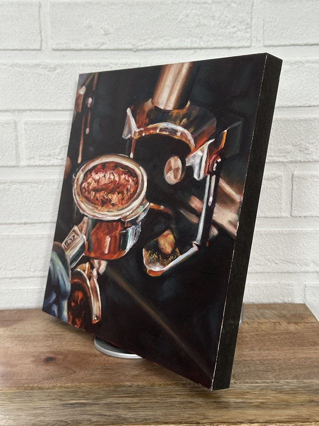 Dieses handgemalte Original zeigt den Zauber eines frisch gebrühten Espressos mit warmen Brauntönen, feinen Reflexen und einem Hauch Kupfer. Diese Farben schaffen Tiefe und eine Stimmung voller Ruhe.
