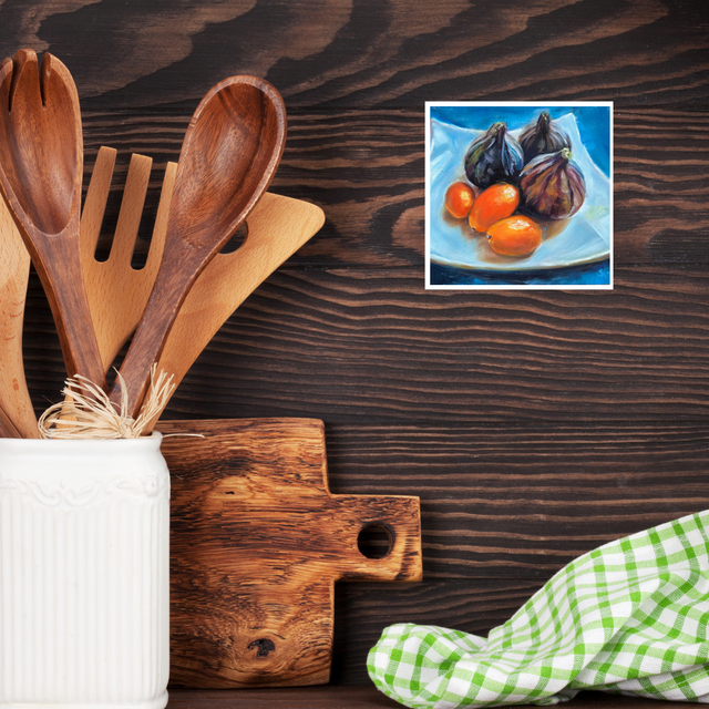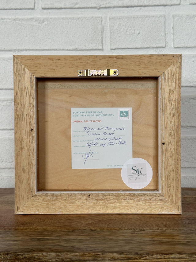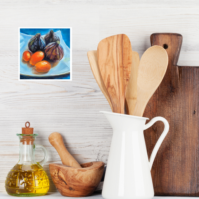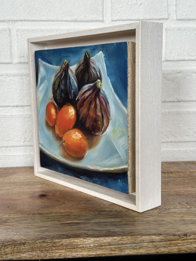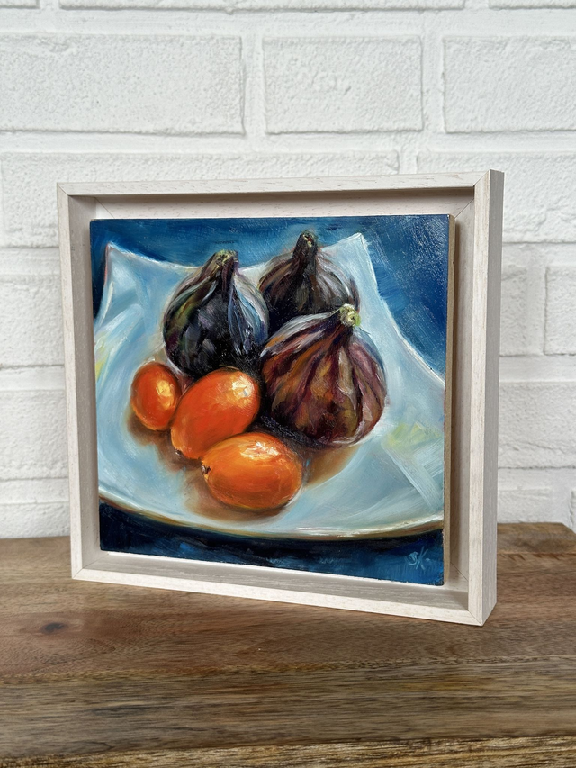 In meinem Ölgemälde “Feigen mit Kumquats” sprechen die Feigen in ihrer satten Farbe und üppigen Form die Sinne an. Vor ihnen liegen die kleinen, leuchtend orangefarbenen Kumquats, die mit ihrer lebendigen Präsenz einen faszinierenden Kontrast zur Weichheit der Feigen bieten. Das Bild lädt Dich ein in die Welt der Aromen und Farben einzutauchen.