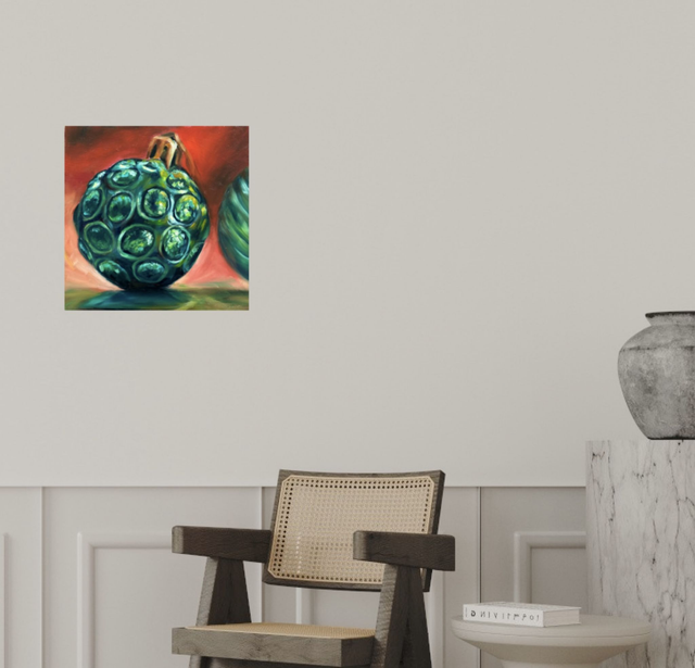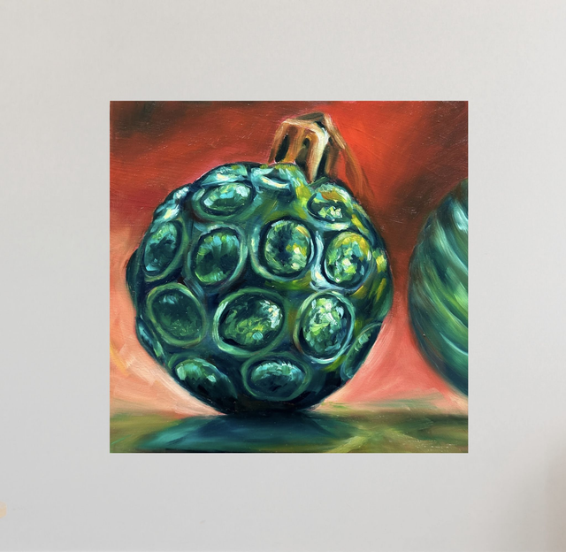 Die glänzende Weihnachtskugel in sattem Grün fängt das Licht besonders stimmungsvoll ein und bringt eine warme, elegante Note in dein Zuhause. Mit jedem Pinselstrich zeigt sich die Liebe zum Detail, die diesen kleinen Farbpunkt so lebendig wirken lässt.