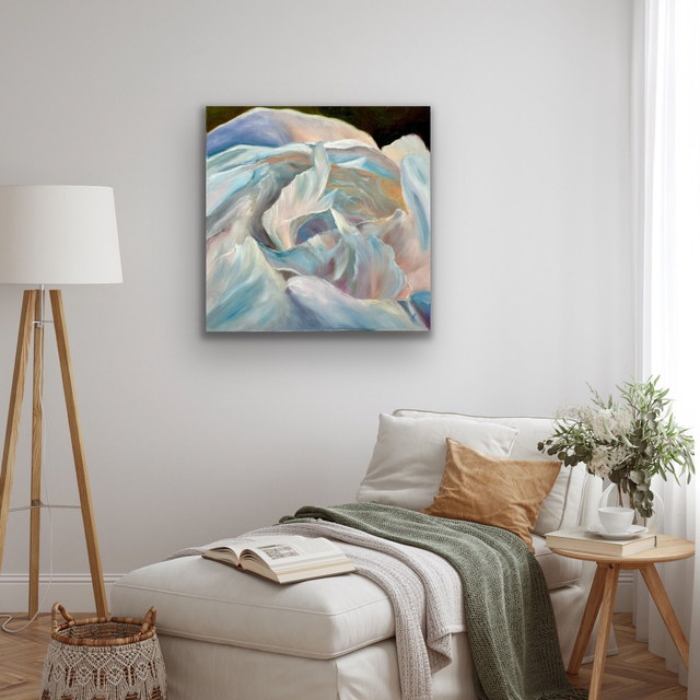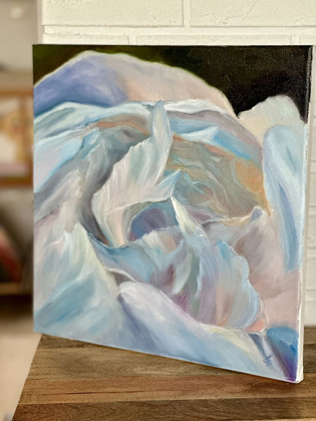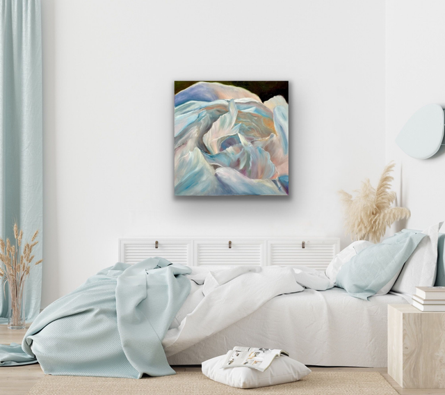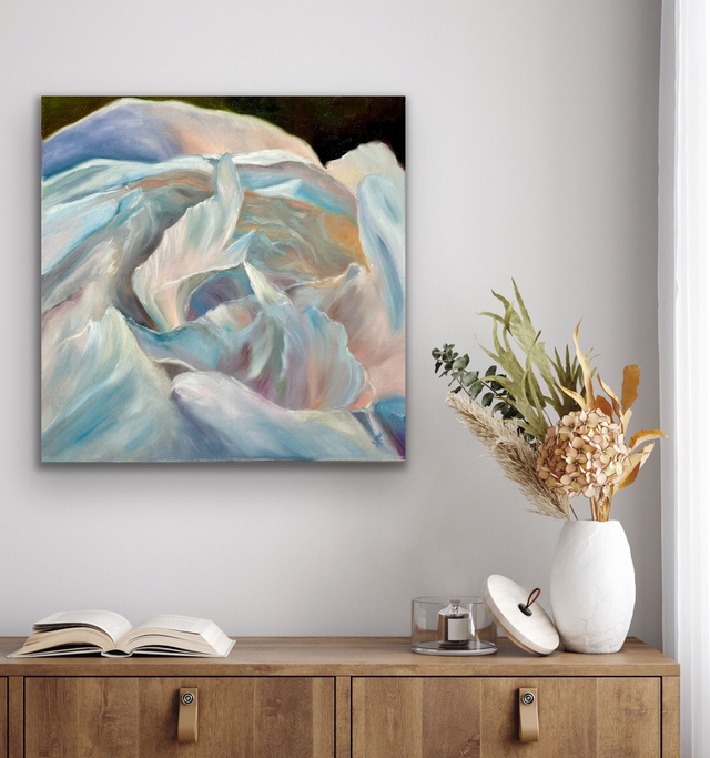 Ein Moment voller Ruhe und Leuchtkraft: Zarte Blütenblätter entfalten ihre Strahlkraft im feinen Zusammenspiel von Weiß, Rosé und Grün. Diese handgemalte Pfingstrosenblüte vereint Eleganz und Natürlichkeit und bringt Licht und Leichtigkeit in dein Zuhause.