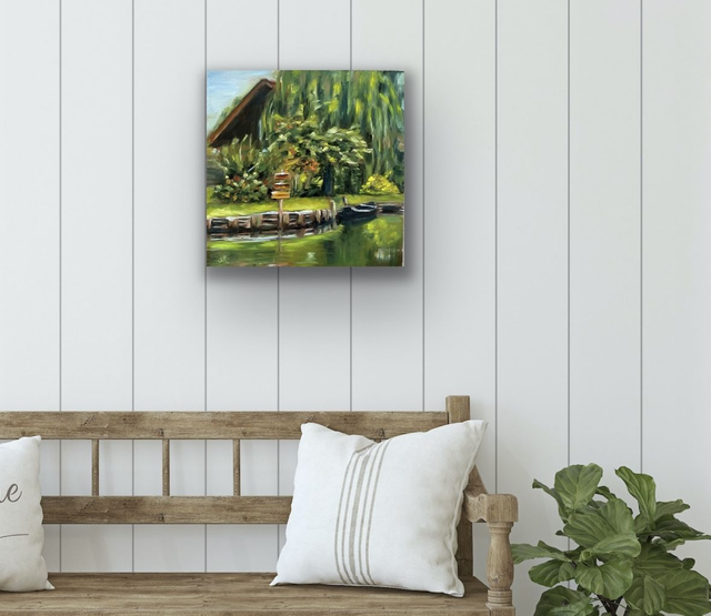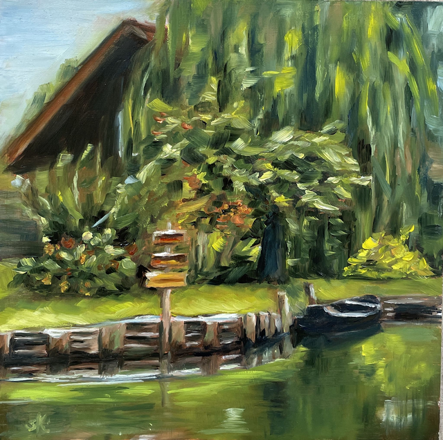 Ein friedlicher Moment am Ufer wurde hier in leuchtenden Ölfarben festgehalten. Dieses kleine Original zeigt eine ruhige Szene aus dem Spreewald. Ein Kahn liegt vor einem Haus; eingebettet in sattes Grün. Perfekt für ruhige Räume oder als besonderes Geschenk für Naturfreunde.