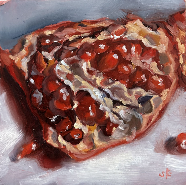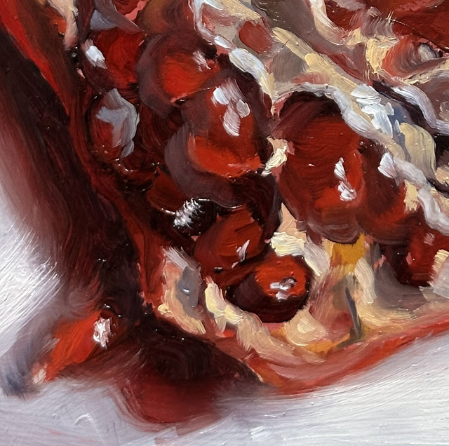 Dieses Mini-Ölbild zeigt die warmen Rot- und Brauntöne eines aufgebrochenen Granatapfels – lebendig, natürlich und voller kleiner Details, die beim Hinsehen Freude machen.