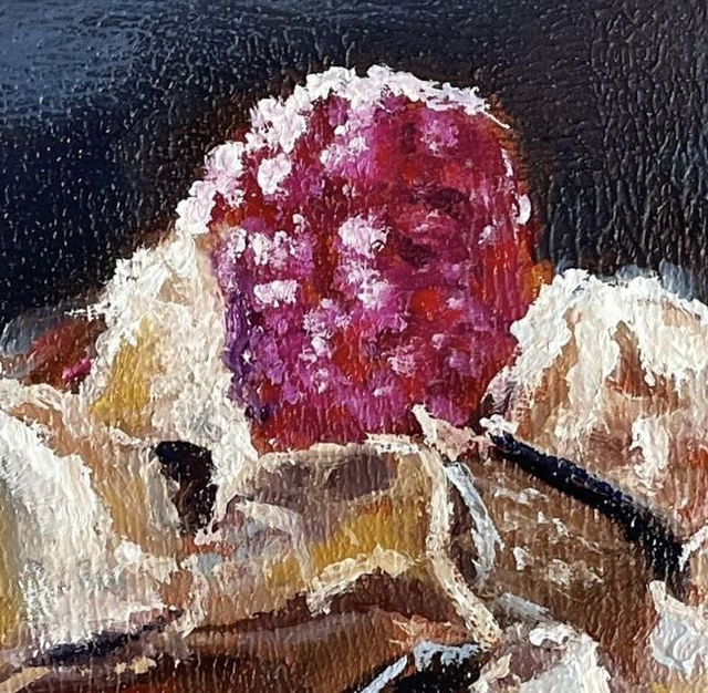 Dieses handgemalte Original zeigt ein saftiges Törtchen in feiner Ölmalerei – detailreich, farbenfroh und voller Lebensfreude. Die zarten Strukturen und warmen Farbtöne erinnern an den Duft eines kleinen Cafés und laden zum Genießen ein.