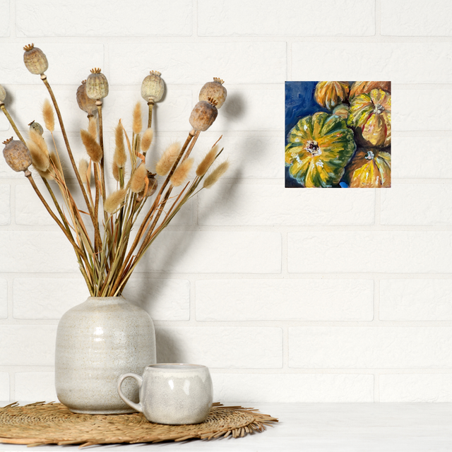 Ein kleines Stillleben voller Herbstwärme: Leuchtend gelb-grüne Kürbisse in kräftigen Farben bringen Lebendigkeit und Gemütlichkeit in dein Zuhause. Dieses handgemalte Unikat setzt als Blickfang in Küche, Esszimmer oder Wohnzimmer einen warmen, saisonalen Akzent und lässt sich wunderbar mit weiteren Kürbis-Motiven kombinieren.