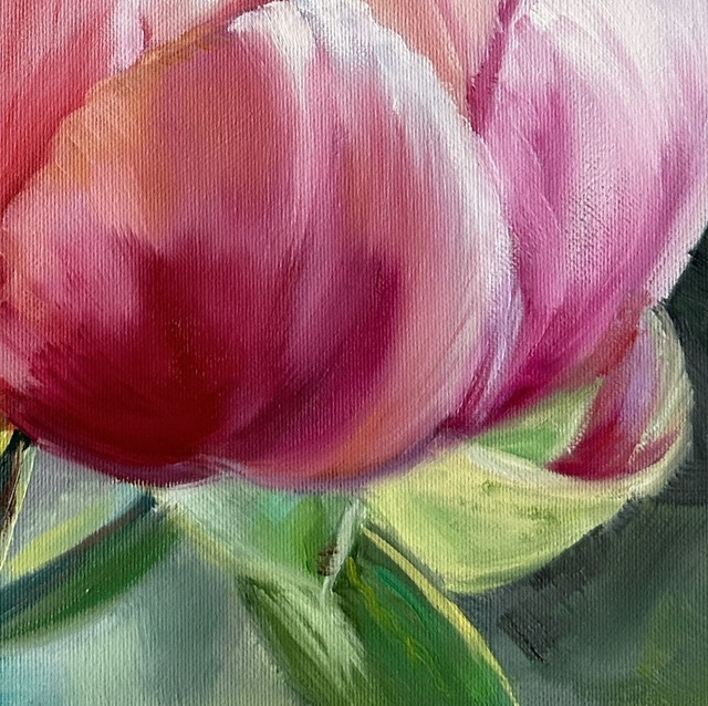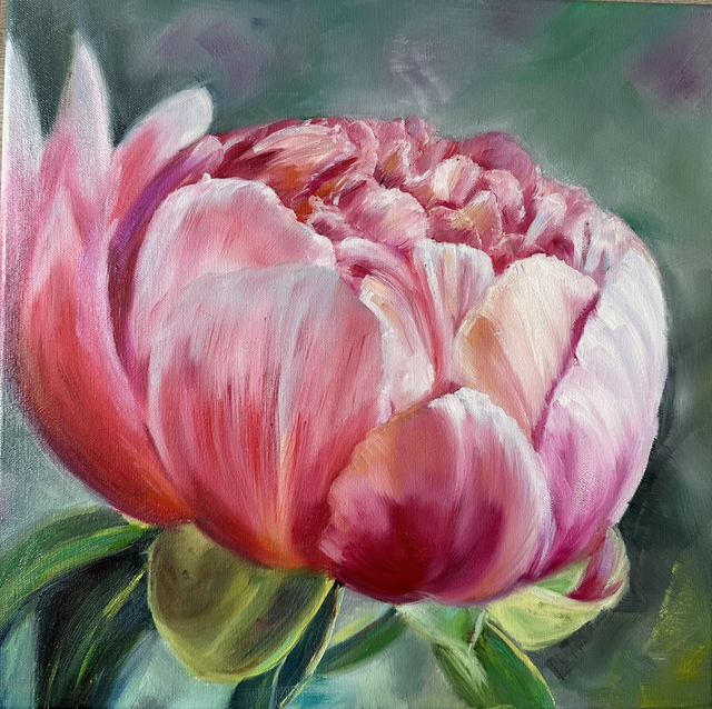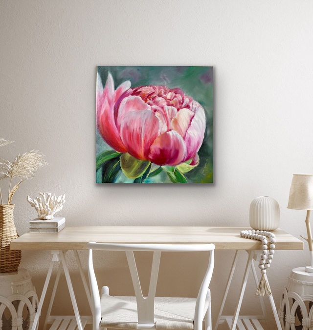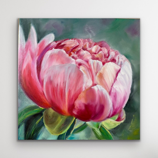 Diese Pfingstrose zeigt sich in kräftigem Rot und zartem Grün; ein Stillleben voller Leben und dennoch von sanfter Stille. Das handgemalte Ölbild fängt den Zauber dieser Blüte im Moment des Aufblühens ein und bringt natürliche Wärme in jeden Raum.