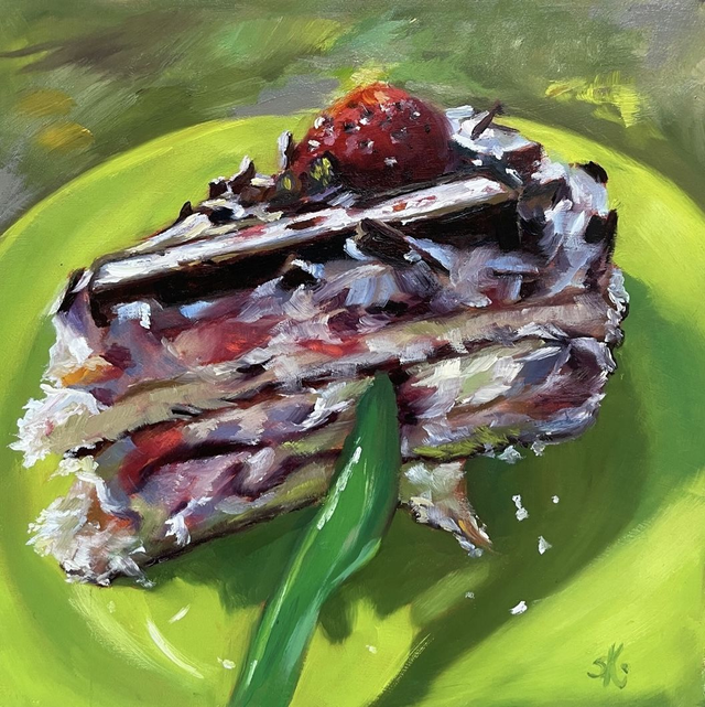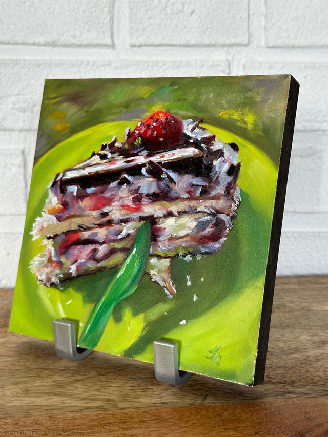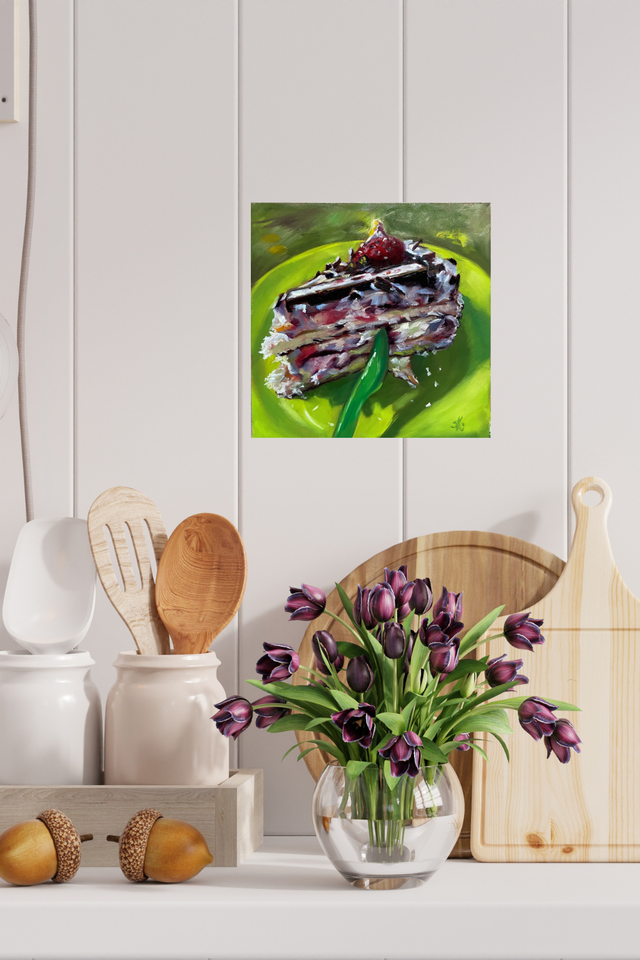 Ein Moment voller Farbe, Genuss und Sommerlaune. Dieses handgemalte Stillleben zeigt eine saftige Erdbeer-Schokotorte im warmen Licht. Es erinnert an sonnige Nachmittage im Grünen und bringt Lebensfreude, Farbe und Genuss in dein Zuhause.