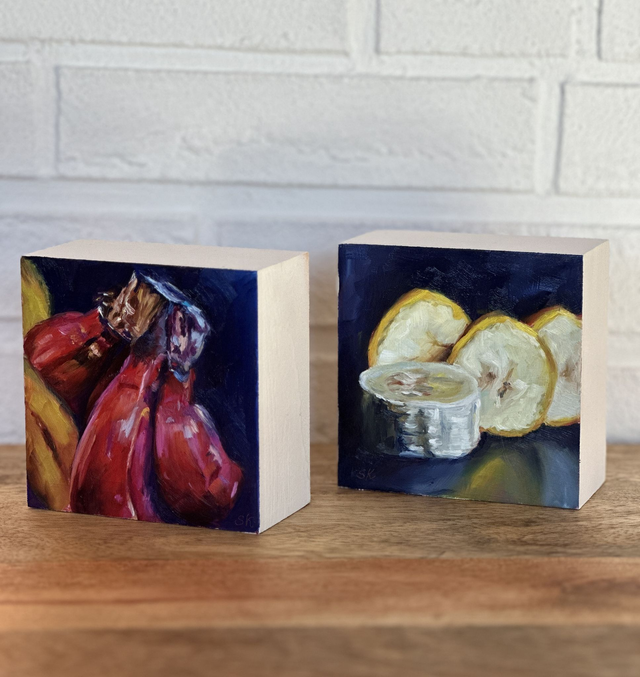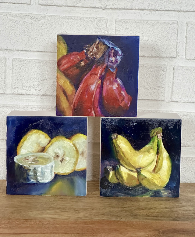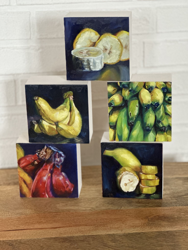 Das kleine Ölgemälde kannst Du auch wunderbar mit den anderen kleineren Ölbildern der Mini-Serie "Alles Banane" arrangieren. Probiere es aus!