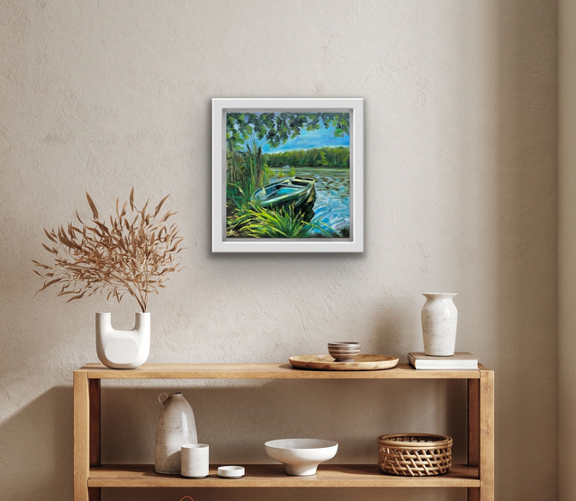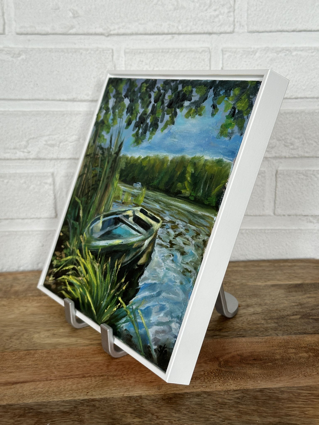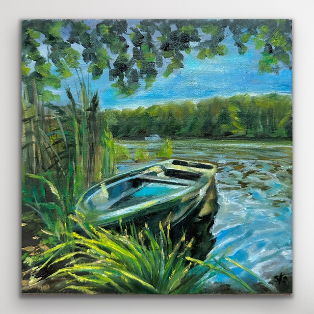 Ein kleiner Moment voller Ruhe und Licht: Dieses handgemalte Ölbild zeigt die stille Schönheit des Spreewalds – ruhige Wasserwege, ein Boot im sanften Licht und leuchtendes Grün im Kontrast zum klaren Blau des Himmels.