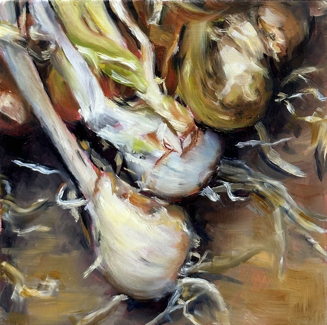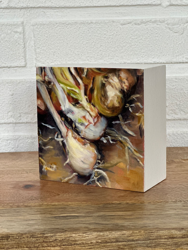 Ein kleines, intensives Stillleben: Zwiebeln und Knoblauch mit feinen Wurzeln, lebendig gemalt mit Licht, Struktur und kräftigen Farben. Dieses Unikat bringt Wärme und Natürlichkeit in dein Zuhause – als Blickfang in Küche, Esszimmer oder auf einem schmalen Regal, auch ideal als Geschenk.