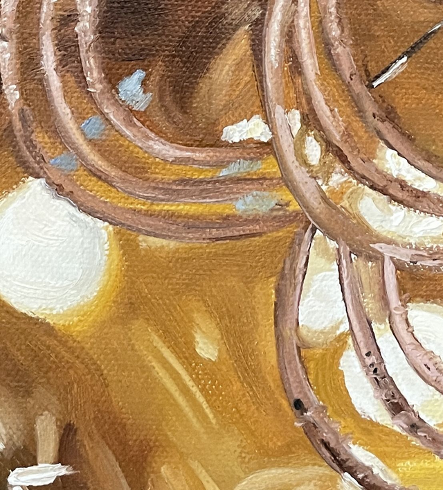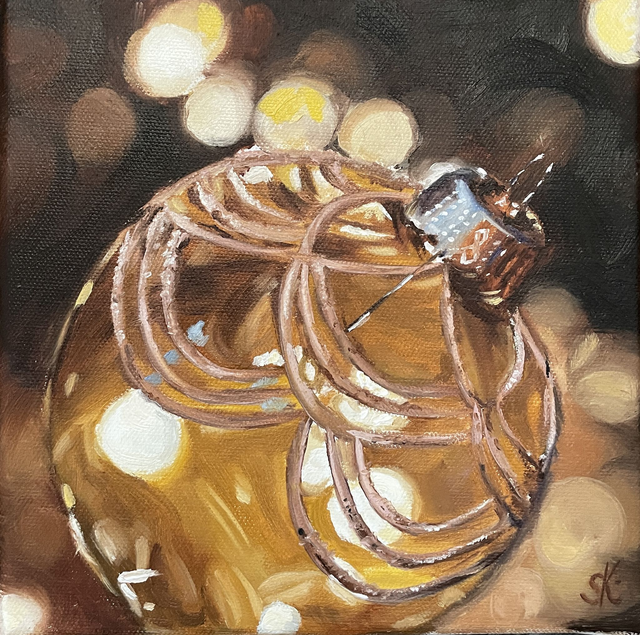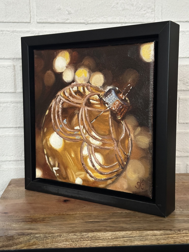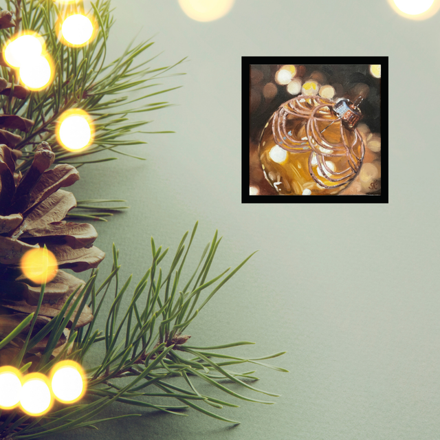 Eine leuchtende Weihnachtsbaumkugel voller Glanz und Wärme. Goldene Reflexe und sanfte Schatten verleihen diesem handgemalten Original Tiefe und festliche Ausstrahlung. Das kleine Ölbild bringt stilvolle Weihnachtsstimmung in dein Zuhause; sei es als Akzent in deiner Küche, in deinem Esszimmer oder in deinem Wohnzimmer.