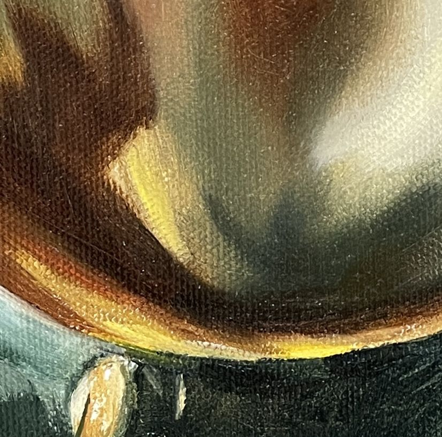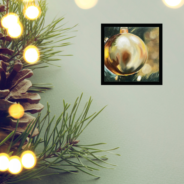 Ein festliches Stillleben voller Glanz und Wärme: Dieses handgemalte Original-Ölbild zeigt eine leuchtende Weihnachtsbaumkugel in warmen Farbtönen und edlem Lichtspiel. Es verleiht deinem Zuhause weihnachtliche Eleganz – ob in Küche, Esszimmer oder Wohnzimmer und ist zugleich eine stilvolle Geschenkidee für die Adventszeit.