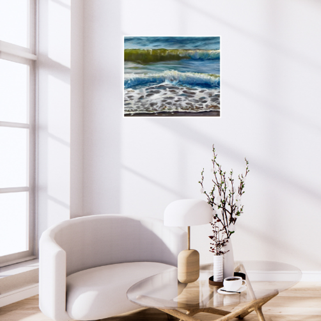 Wellen faszinieren immer wieder und vermitteln Urlaubsstimmung. Sie sind einfach Balsam für die Seele. Man könnte ihnen stundenlang zusehen und beim Meeresrauschen seinen Gedanken freien Lauf lassen. Dieses Bild lässt Dich vom nächsten Urlaub träumen und den Alltag ein bisschen vergessen. Das Bild ist 40 x 50 cm groß, in Öl auf Leinwand gemalt und hat einen weiß gekalkten Schattenfugenrahmen. Die Gesamtgröße beträgt 45 x 55 cm.