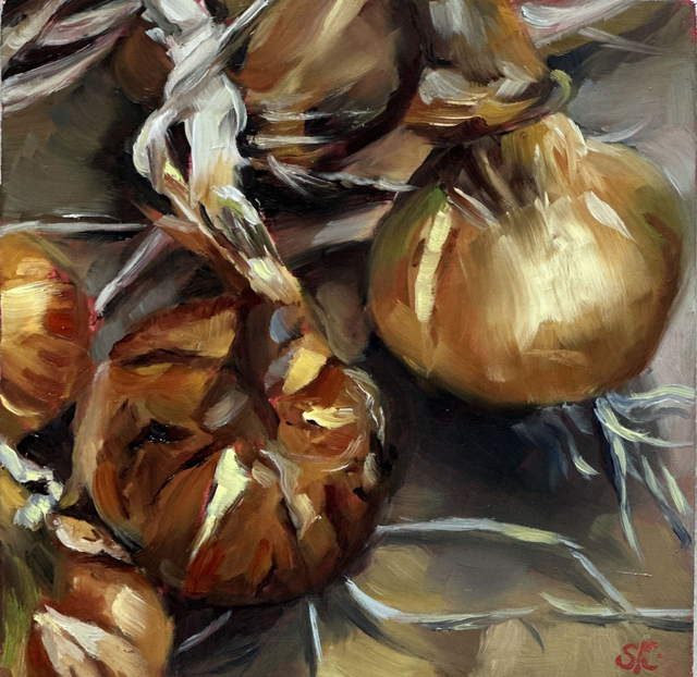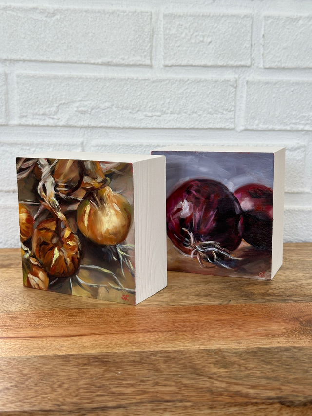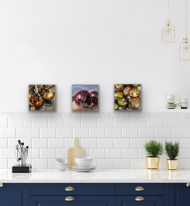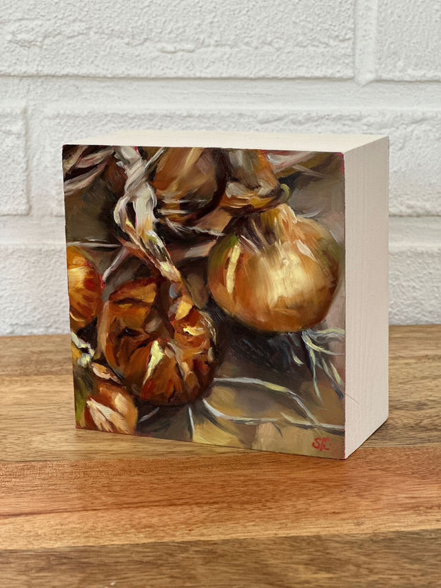 Dieses handgemalte Stillleben zeigt frische Zwiebeln im warmen Licht mit lebendiger Pinselarbeit und feinen Farbnuancen. Die Kombination aus Braun-, Rot- und Schalentönen verleiht dem Motiv Tiefe und Authentizität. Ein kleines Ölbild, das zu einem stimmungsvollen Blickfang wird.